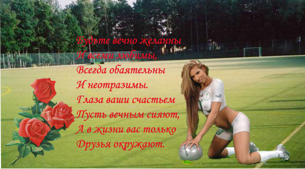 Футбол и женщины - что их объединяет? Предлагаем всем игрокам в поздравительной форме ответить на этот вопрос в виде открытки, созданной в любом графическом редакторе (Photoshop и т.п.). Свои работы необходимо размещать в этой теме до 16 марта включительно.