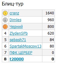 У меня тоже 8 игроков в блице на этой неделе, причем с одним из них на прошлой неделе уже были вместе. Жесть... Я думал хоть 4 призовых места... -------------------- |