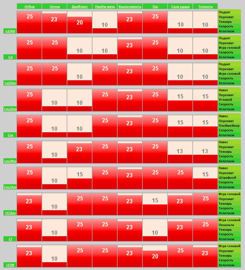 норма хороша против защиты защита хороша против суперзащиты суперзащита хороша против нормы защита еще хороша против атаки суператака против атаки хороша но ее норма делает с защитой 4-3-3 против 3-5-2,3-4-3,5-3-2,4-5-1,3-3-4,2-4-4,4-2-4 4-4-2 против 4-3-3,4-2-4,3-4-3 3-5-2 против 4-4-2 и 3-4-3(не проверял) 5-3-2 против 4-4-2 4-2-4 против 3-4-3 3-3-4 против 4-4-2,3-4-3 3-4-3 против 3-5-2 4-2-4 против 3-3-4 2-4-4 против 3-3-4 игра в пас эффективна против нормальной стратегии нормальная стратегия эффективна против дальних ударов дальние удары эффективны против техничной игры техничная игра эффективна против игры в пас нормальная игра эффективна против техничной игры Cd - опеку Ld Rd - отбор Lm Rm - дриблинг, пас, приём мяча Cm - приём мяча, пас Lf Rf - точность, дриблинг, пас Cf - точность, силу |