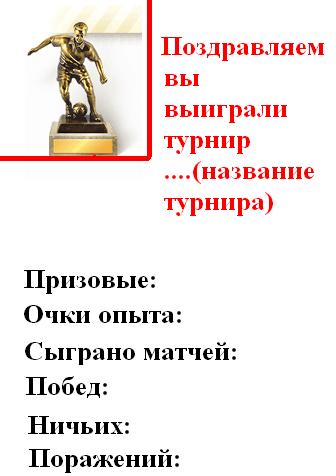 Там будет небольшая статистика по выигранному турниру. Просто после очередной победы в турнире даже не ощущаешь себя победителем, а тут хоть тебе напомнят об этом!!! Эскизы прикрепленных изображений -------------------- |