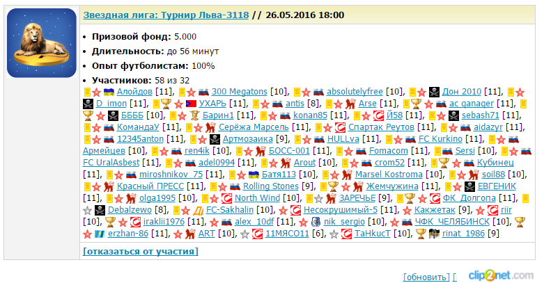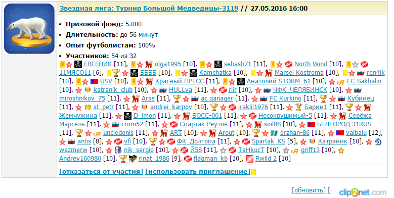S1 Интер-лига: Богемный турнир. это вообще отдельная тема. турнир на 32 участника без спарринг-ботов. очень редко заполняется. S1 Интер-лига: Звездный турнир, Кубок молодых бурундуков, почему уменьшили призовые? до ЧМ призовые были намного больше. |