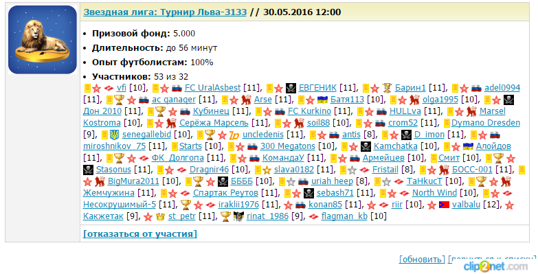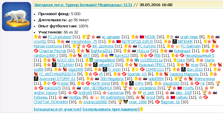 Звёздная лига. В дополнение прикладываю ссыль, вызывающий вопросы. В данный турнир регистрировалось 62 участника. Из них 52 участника воспользовались пригласительным билетом, "дающем ГАРАНТИРОВАННОЕ ваше попадание в число участников турнира", как ясным языком написано в объяснении сути пригласительного билета. Продолжу - из 52 участников, использовавших пригласительные билеты было 36 менеджеров 11-го уровня, т.е. больше, чем вмещает кубок звездной лиги. Каков результат? Правильно, в турнир попали ТОЛЬКО 11-й уровень, да и то не все желающие. Что уж говорить про менеджеров ниже 11-х уровней, имеющих ВИП Олигарх, регулярно приносящих доход проекту, но постоянно не попадающих в турниры Звездной лиги. Просьба к Вам только одна - на время проведения текущего Чемпионата Мира увеличьте число участников в турнирах Звездной лиги до 64, чтобы в них могли играть все желающие. спасибо за понимание http://s2.11x11.ru/tournaments/7838459 |