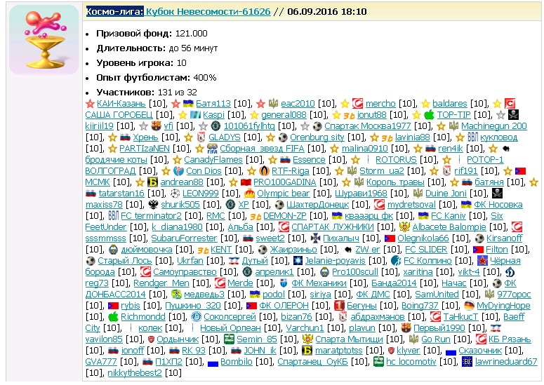 Космо-лига: НЛО-71906 Призовые за победу: 12000 (итого 38000) Очки славы за выход в следующую стадию: 0 (итого 0) Космо-лига: Лига Космических туристов-56959 Призовые за победу: 13000 (итого 38550) Очки славы за выход в следующую стадию: 0 (итого 0). Исправьте, пожалуйста. |
