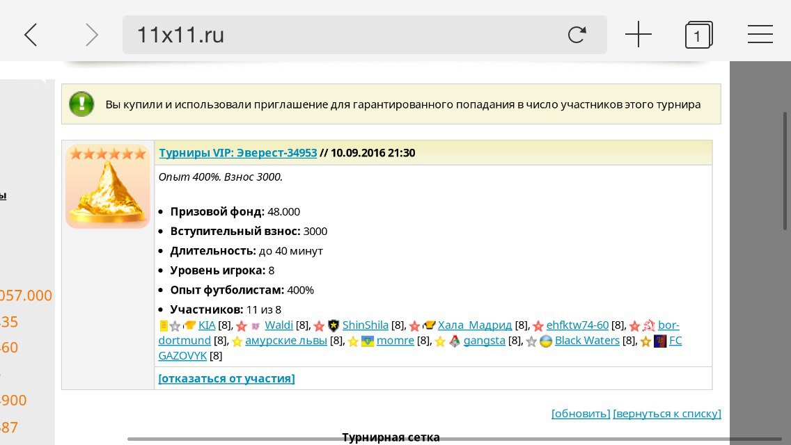 Есть просьба увеличить количество команд в випах на 9-м уровне до 16-ти учасников! С рангом президент попадаю в 2-3 турнира за день! Команд много перешло с 8-го, а там было на 16 человек, и все сейчас играют тут, а люди и на 9-м были же, и много... Спасибо! добавил картинку! Жду вашего решения Сообщение отредактировал momre - 8.11.2016, 23:21 Эскизы прикрепленных изображений |