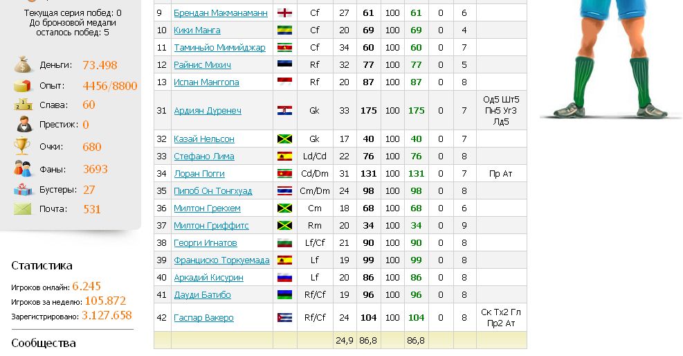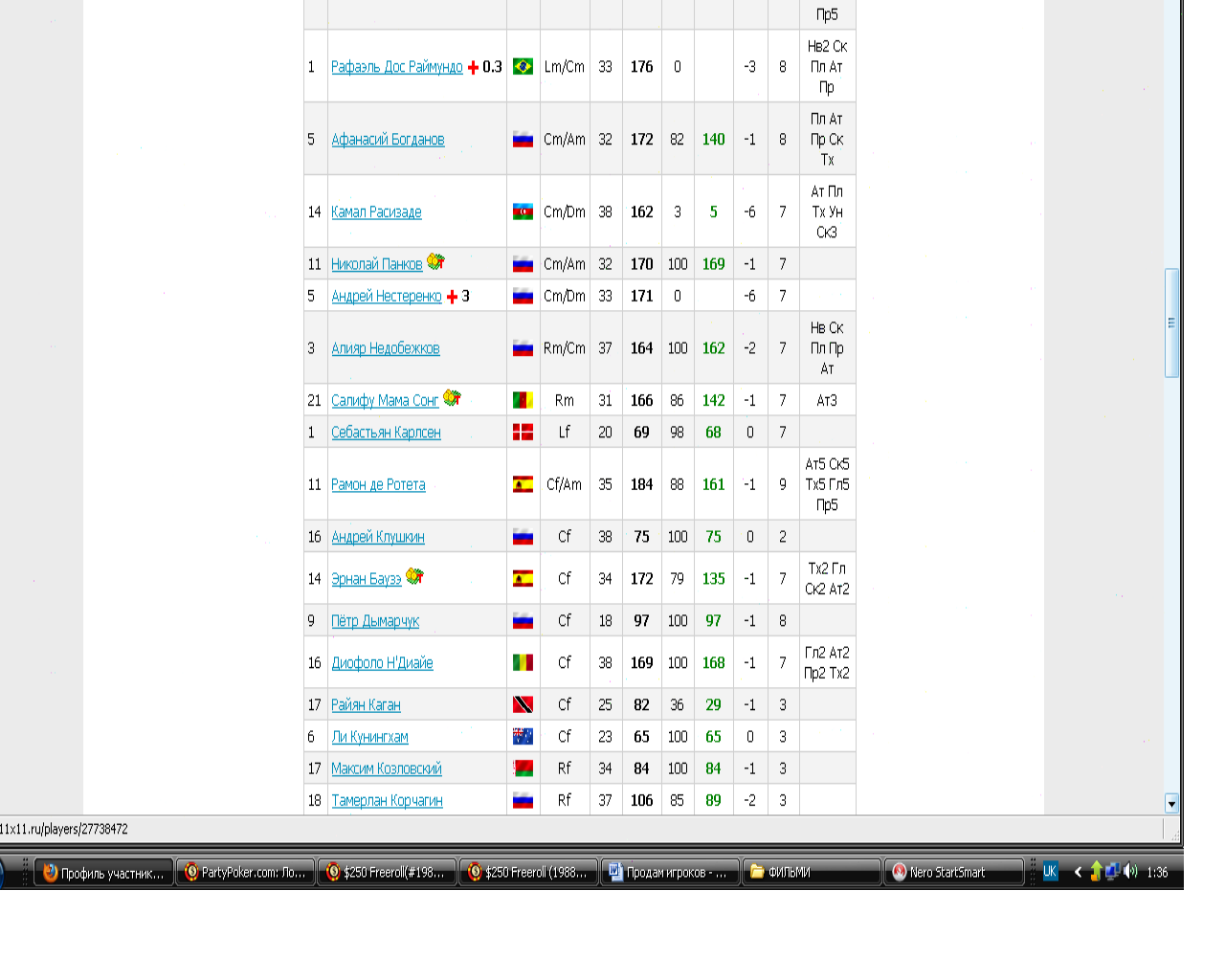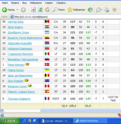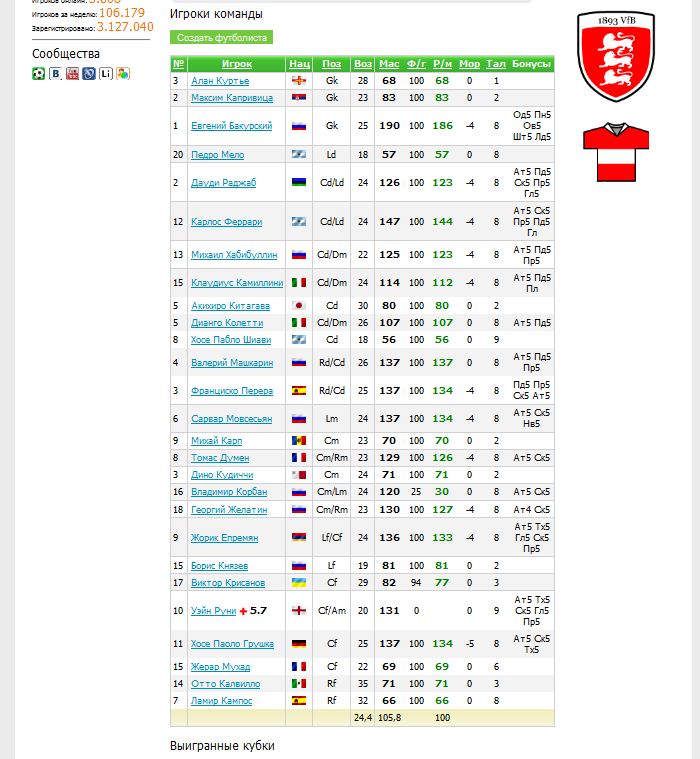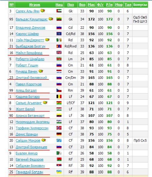 Игроки команды № Игрок Нац Поз Воз Мас Ф/г Р/м Мор Тал Бонусы 99 Мацей Холовня Gk 37 162 100 156 -7 8 Шт5 Од5 Пн5 1 Толуатау Бёрд Gk 35 77 100 77 0 3 99 Игорь Беккер Gk 39 112 100 112 0 6 15 Дай Хо Жин-Хо Cd 32 140 100 135 -7 7 16 Анатолий Берко Cd/Dm 27 147 100 142 -7 6 Пр3 Ат Пд Тх 62 Эдди Ломпарт Cd/Rd 29 111 100 111 0 6 2 Томаш Трунечка Cd/Dm 25 114 100 111 -5 7 Пд5 Пр5 Тх2 Ат2 Ск2 15 Фатмир Лубиштани Cd 38 127 100 124 -5 6 6 Габор Тот Брлаш Cd 39 125 100 123 -4 6 5 Эрик Гулик Lm 39 131 100 126 -7 7 7 Кржистов Блаш Lm/Cm 28 129 100 126 -5 6 17 Эдуард Богданов Cm/Dm 37 127 100 123 -7 6 Пр2 11 Диего Канело Cm 19 39 100 39 0 6 Пр 3 Лилиян Мира Cm/Rm 27 135 100 130 -7 7 Пл5 Тх3 Пр2 6 Мохамед Хичем Азиун Cm 31 125 100 125 0 7 18 Себастьен Брунель 1.5 Rm 39 105 0 1 6 7 Эдуардо Луис Бонан Rm 37 142 100 137 -7 6 30 Эдмунд Боатенг Cf 39 89 100 90 2 6 9 Томаш Бадал Cf 23 67 100 67 0 6 3 Амбро Бибби Cf 25 75 100 75 0 7 16 Джос Джункал Cf 33 130 100 125 -7 7 Ск5 Гл5 Ат5 Пр5 Тх5 5 Штринге Андриан Cf 36 138 100 133 -7 7 Тх Ат 11 Дадо Баян Cf 33 120 100 122 3 7 Ск5 Ат3 Гл2 17 Нестор Рид Cf/Am 32 153 100 148 -7 8 Ск5 Гл5 Тх5 Ат5 Пр5 12 Сезар Жиль Rf/Cf 32 108 100 108 0 7 32,4 117,1 115,2 - |