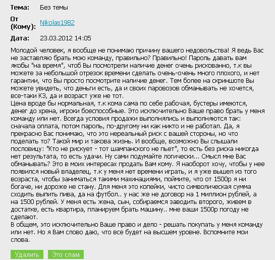 Писал в поддержку. Писали в поддержку другие, которым поступали такие предложения, выяснилось, что некоторые перечисляли ему деньги. Письма с его предложениями были отправлены в спам, якобы спам просматривается администрацией и он получит БАН. Игрок продолжает сидеть в чате и искать клиентов. В УК РФ эта статья называется мошенничество, на просторах игры 11х11 видимо это таковым не считается. В доказательства прилагаю скрин-шоты. Уважаемая администрация сайта у Вас под носом гадят, а вы не обращаете на это внимание, и позволяете мошенничеству безнаказанно проводить свои авантюры. Эскизы прикрепленных изображений |