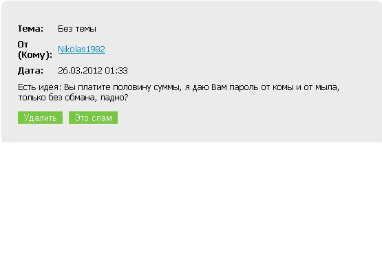 Заодно администрацию сайта потревожат... ... а програмистам на эту проблему вообще "испражняться" Администрация сайта не имеет никакого отношения к личным беседам 2-х пользоватей.Программисты никак не связаны с попытками граждан купить аккаунт.Единственно,что они могут сделать,это заблокировать акк в случае смены IP. Вносите соответствующее предложение,если оно будет принято,то ваш купленный акк просто будет забанен. |