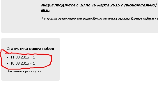 Заработал,но вкривь и вкось.счетчик побед за 10 марта=1,хотя у меня их уж точно не меньше 15,сам считал,ручками.День выкинули.Посмотрим что будет завтра на счётчике 15 уже набил.Беда за бедой.То по ставкам кидают,правда вернули после обращения в поддержку-а если бы не обратился,забыл,просмотрел;то счётчик шалит НУ,ни 1 у меня победа это уж точно у меня вообще 0 ) хотя одержал больше 30 точно) админам отписал посмотрим что будет) |