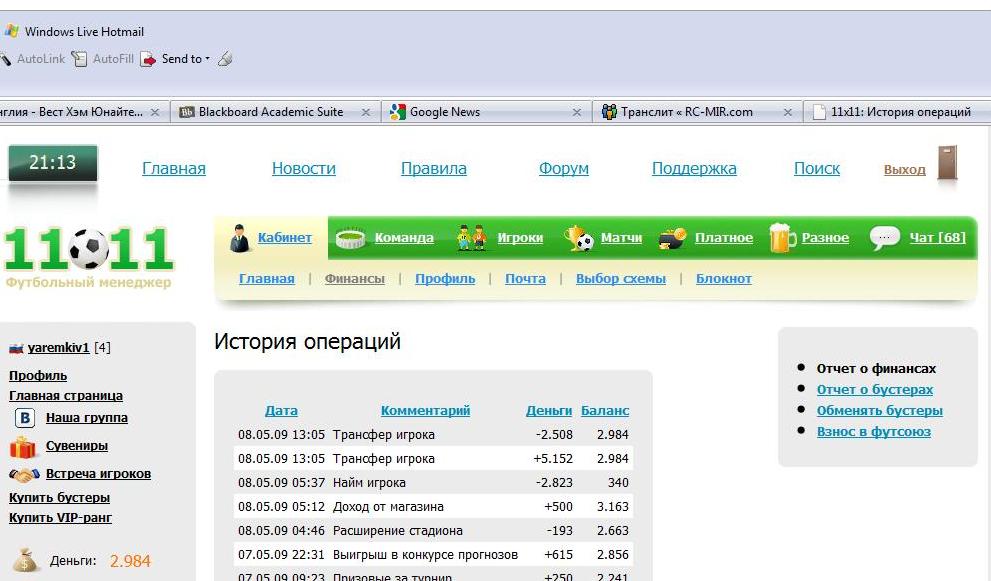 Незнаю у кого то это было или нет, а у меня какая ерунда получилась. Я вчера выставил на трансфер игрока которому 17 лет за 2644 и сразу начали на него ставить первым поставил игрок третьего разряда так как я его профиль посмотрел через архив матчей, за 20 минут до конца транфера уже было 6 ставок и цена была 5.152 а сегодня проснулся посмотреть свой профиль и был удивлён так как мой игрок продался ниже суммы которой я выставлял его на трансфер, хотя когда я зашёл было написанно что ваш игрок продался за 2644 это та сумма за которую я его выставил и где хотя плюс 10%, потом я посмотрел Историю операций и увидел какую то ерунду 08.05.09 13:05 Трансфер игрока +5.152= 2.984 08.05.09 13:05 Трансфер игрока -2.508=2.984, прошу разобраться или обьяснить в чем причина Извените! Я ещё не получил точный ответ на мой вопрос, а то у меня есть ещё один игрок которому 17 лет и не хотелось его точно так продать, так что там за фигня у меня получилось с продажей? Сообщение отредактировал yaremkiv1 - 11.05.2009, 10:45 Эскизы прикрепленных изображений ![]() ![]() |