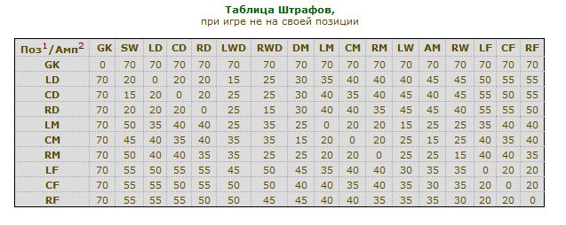 2 строка это Амплуа игрока; Важно знать, что: - штраф начисляется на общее мастерство игрока, т.е. если к примеру амплуа игрока Ld (мастерво 128), а играет он на позиции Cd, то для данного игрока мастерство будет составлять 102 (Общее мастерство -20% штрафа); - если у футболиста имеется Совмещение по позиции то штраф не начисляется, т.е игрок с амплуа Ld/Cd без штрафа может играть на позиции Ld и Cd; - при расчете штрафа учитывается родное амплуа игрока, т.е при игре футболиста с амплуа Ld/Cd на позиции Lwd, штраф будет начисляться с учетеом родной позиции Ld; Сообщение отредактировал NikalA - 2.12.2009, 14:04 Эскизы прикрепленных изображений -------------------- |